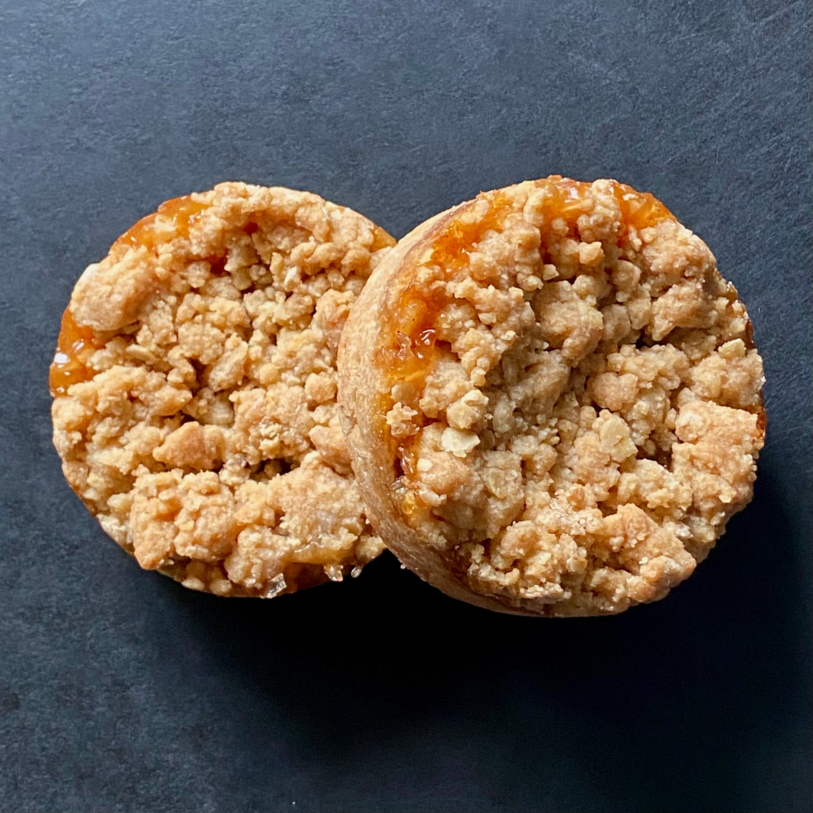 【原材料名】小麦粉(国内製造)、三温糖、ココナッツオイル、菜種油、オーツ麦、りんごジャム(りんご、濃縮果汁(ぶどう、デーツ、レモン果汁)、シナモン)、天日塩、シナモン / 香料、ゲル化剤(ペクチン)