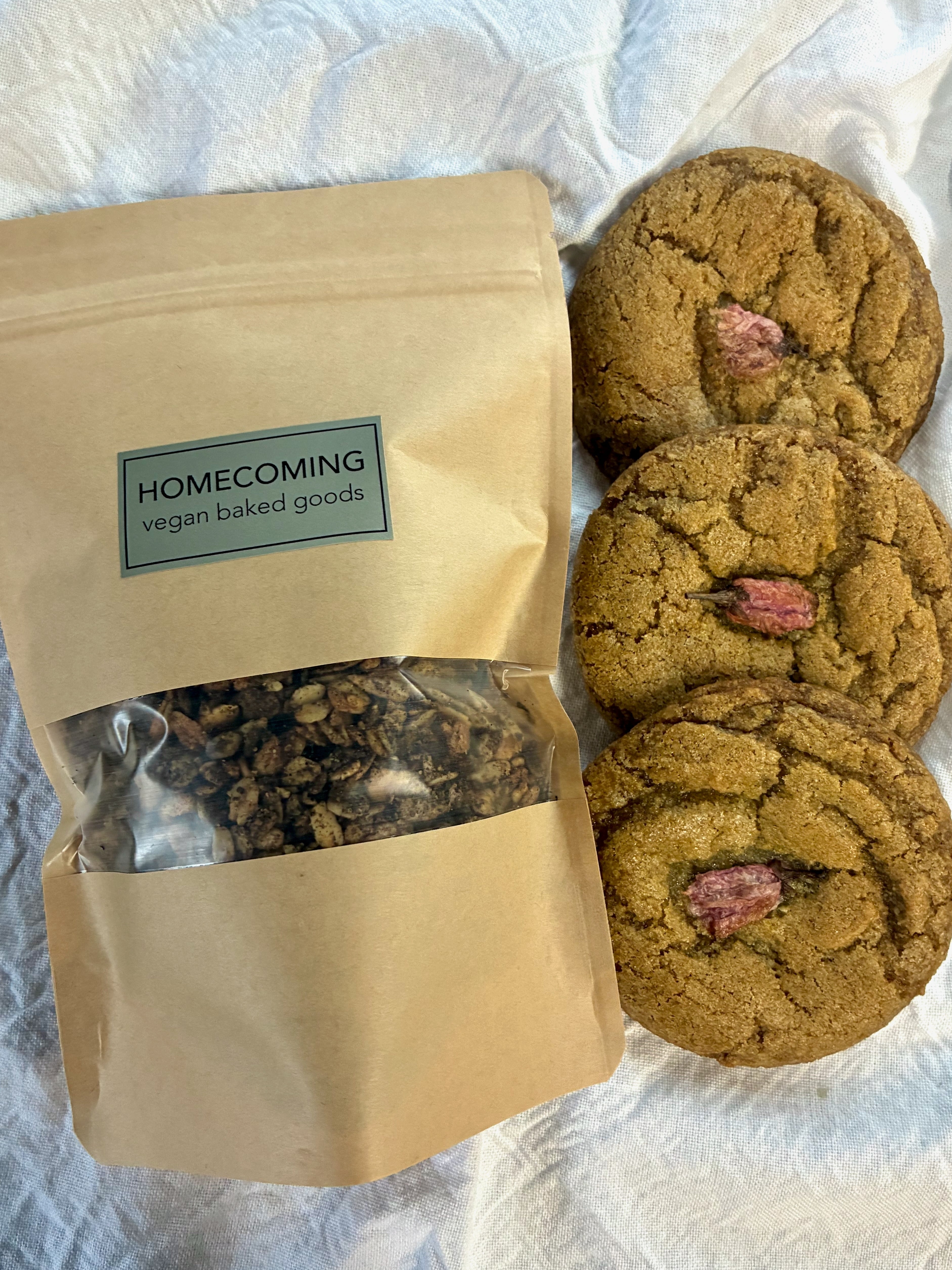 春の限定フレーバーCherry Blossom Cookieが3個と、Homecomingグラノーラの新商品:Hojicha Granola 1袋のセットになります。