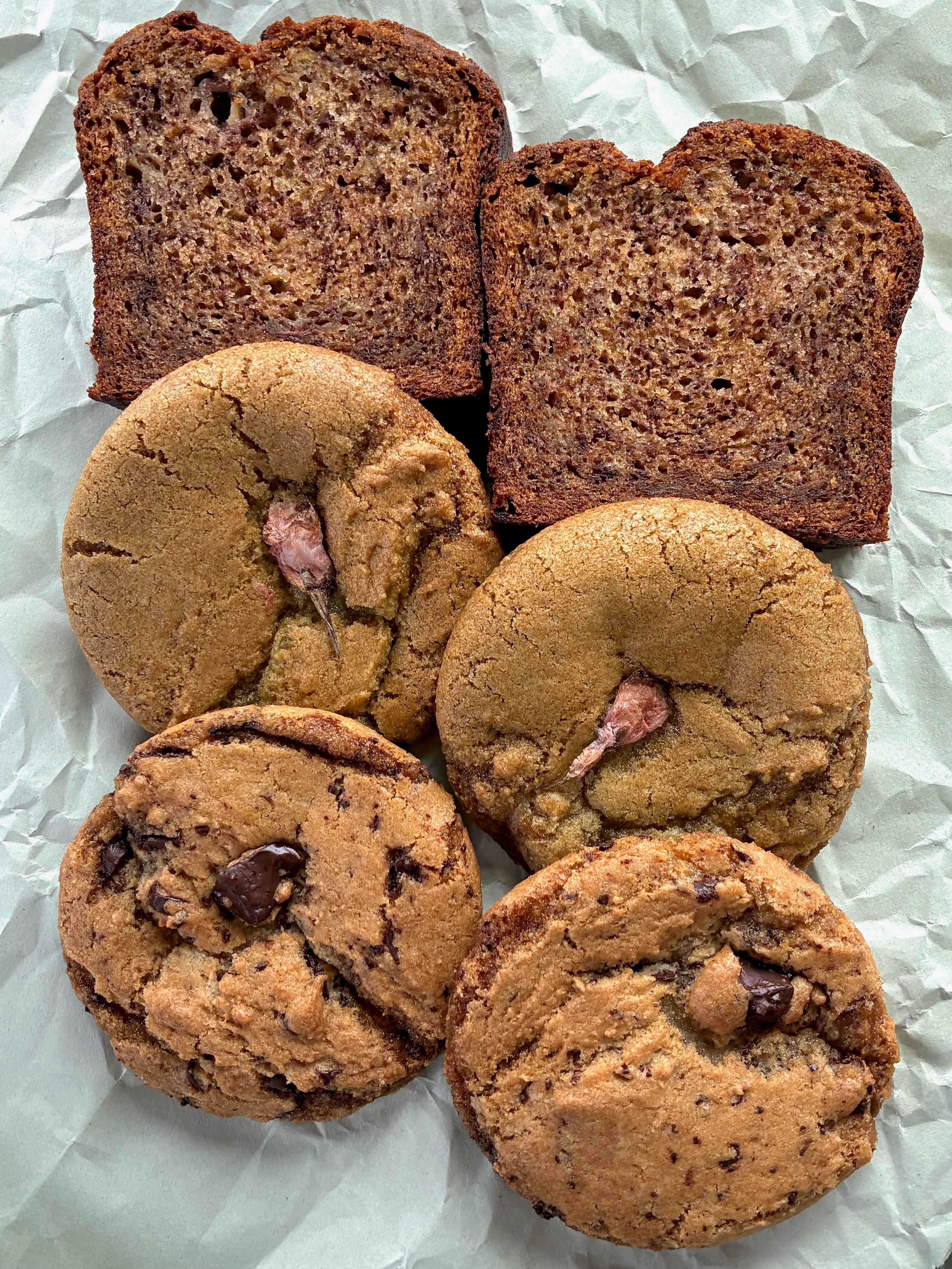 Our super moist Banana Bread is a crowd pleaser! You'll get 2 slices, together with our spring limited Cherry Blossom Cookie, and our OG Chocolate Chunk Cookie.